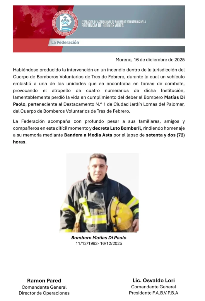 La Federación de Asociaciones de Bomberos de la provincia de Buenos Aires declaró hoy Luto Bomberil por 72 horas, con el respectivo homenaje a la memoria de Matías Di Paolo con las banderas en todos los cuarteles a media asta.