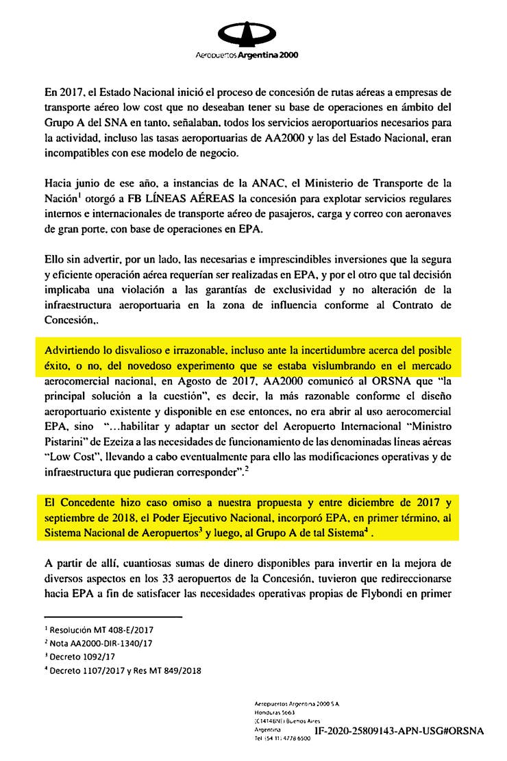 «El intento del Estado Nacional por desarrollar el modelo low cost en nuestro país tuvo, en el aspecto de la infraestructura aeronáutica y los servicios aeroportuarios, una de las facetas más erráticas. La instrumentación de la afectación de El Palomar al Grupo A del Sistema Nacional de Aeropuertos fue quizás la muestra más palpable del accionar improvisado de aquel errante. Concedente con el que, pese a todo, AA2000 debió cumplir sus deberes de concesionario», dice el texto.