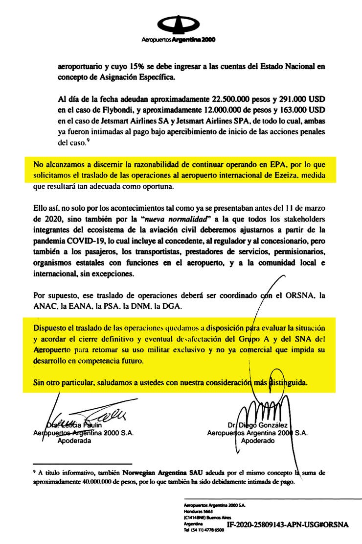En el escrito se explica, además, que “el traslado temporario mejoraría la distribución de pasajeros dentro de la terminal, facilitando la distancia recomendada y colaborando de esa manera con el cuidado y la protección de los mismos”. “Ezeiza se encuentra mejor preparado para realizar todos los controles sanitarios que el protocolo exige. Hoy El Palomar no tiene capacidad para cumplir con el distanciamiento social y los controles necesarios para enfrentar el COVID-19”, concluyeron desde la operadora.