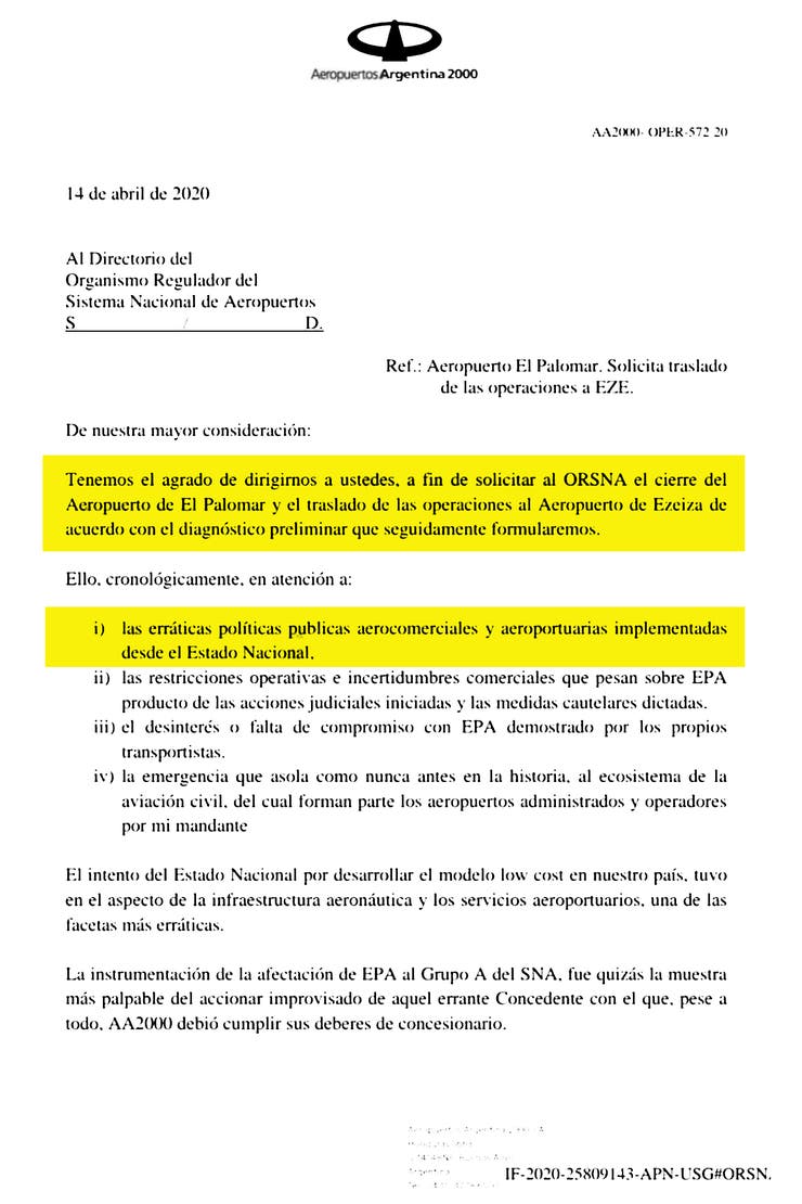 En el texto elevado al ORSNA, la empresa AA2000 enumera cuatro razones por las cuales El Palomar debe cerrarse: las erráticas políticas públicas para el sector, las restricciones operativas por efecto de medidas cautelares presentadas por los vecinos de la zona que se oponen a su funcionamiento, el supuesto “desinterés” de las empresas que vuelan desde allí (Flybondi y JetSmart) y, por último, el impacto del coronavirus que paralizó a la industria aérea. Se sabe: la justicia federal de San Martín limitó las operaciones al horario diurno, y prohibió vuelos y aterrizajes entre las 22 y las 7 para permitir el descanso de la vecindad cercana.