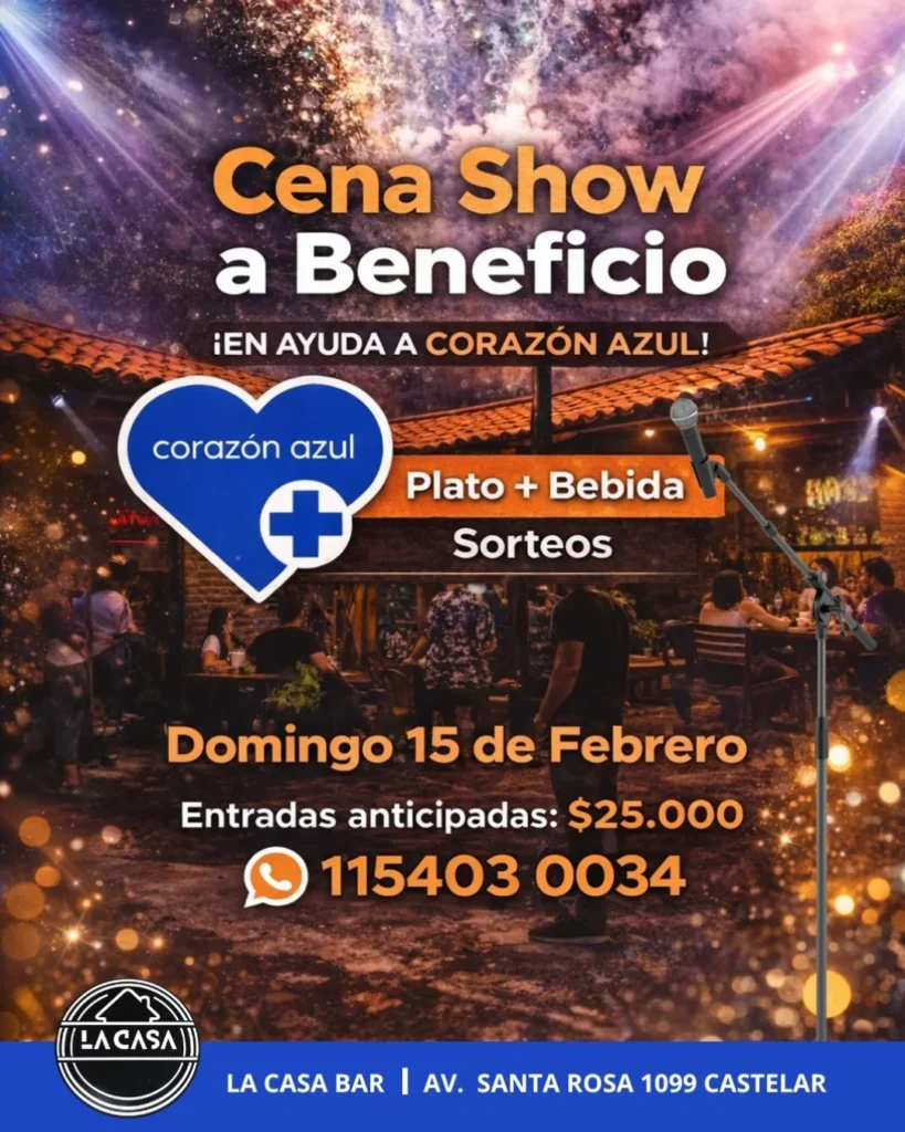 En esta ocasión, la ONG organiza una cena show a beneficio el próximo domingo 15 de febrero en La Casa Bar ubicada en Av. Santa Rosa 1099 de Castelar. Será una cena al aire libre con espectáculo en vivo. El precio de la entrada es de $25.000 e incluye plato principal y bebida.