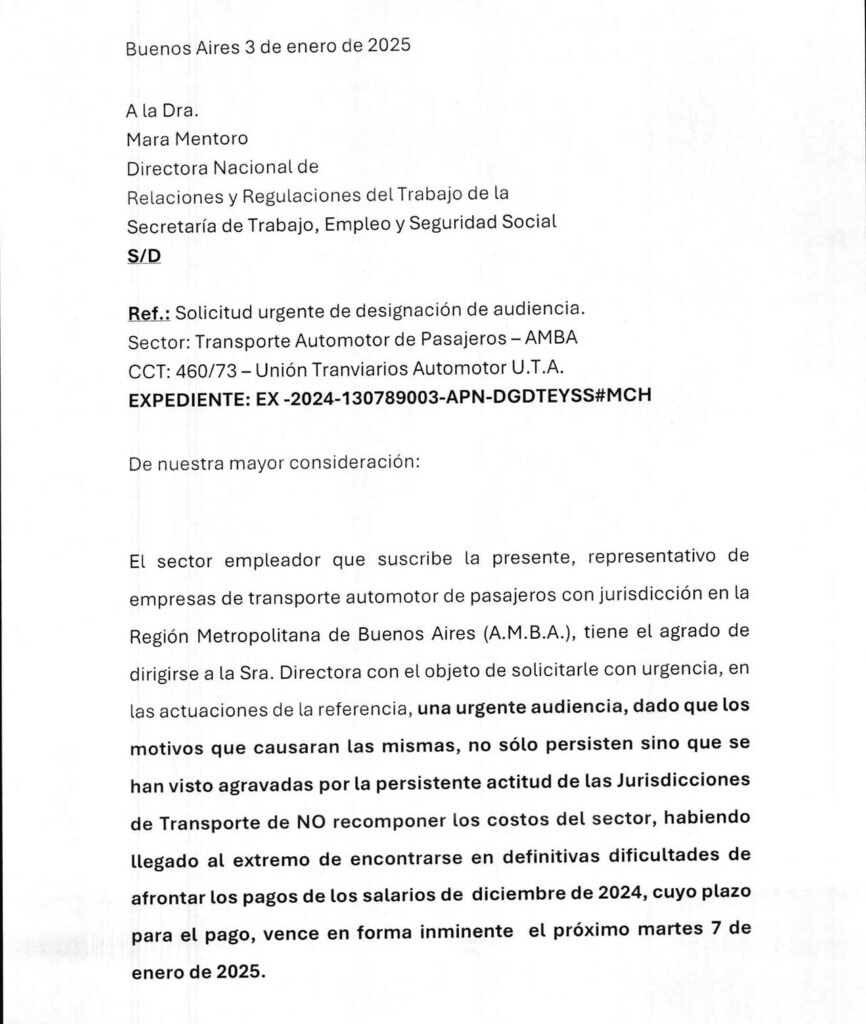 Encima enfrentan una fecha límite: afirman que no podrán garantizar el pago de los salarios correspondientes a diciembre de 2024, cuyo vencimiento está fijado para el martes 7 de enero de 2025. Eso, naturalmente, abre las puertas para la paralización de los servicios por reclamos gremiales si es que la Unión Tranviarios del Automotor (UTA) decide realizar una medida de fuerza, cosa que últimamente no pasó.