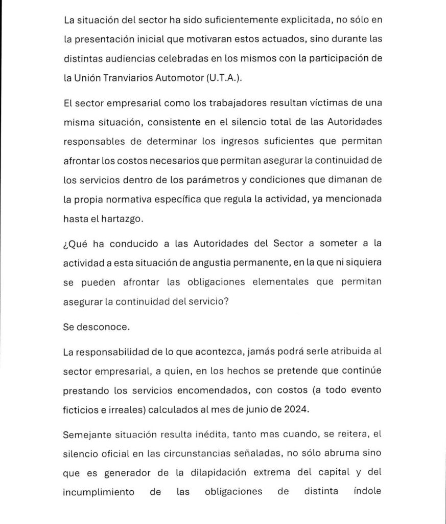 Por último, desde el sector empresario anticipan que esta realidad “inédita” podría desembocar en el colapso del servicio público de transporte y afectar directamente a millones de personas usuarias. “La responsabilidad de lo que acontezca jamás podrá serle atribuida al sector empresarial, que sigue operando en condiciones extremas de inviabilidad económica”, concluyeron.