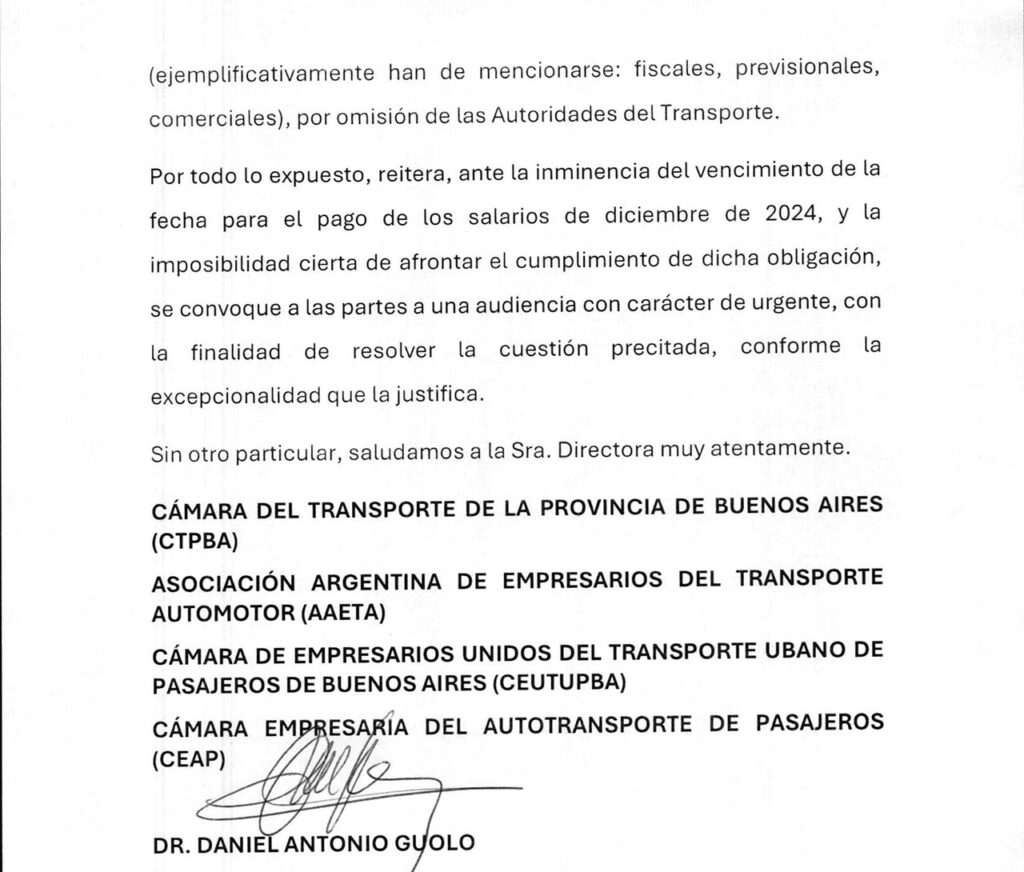 La estrategia ahora es otra: desde la Asociación Argentina de Empresarios del Transporte Automotor (AAETA), la Cámara Empresaria del Autotransporte de Pasajeros (CEAP), la Cámara del Transporte de la Provincia de Buenos Aires (CTPBA), y la Cámara de Empresarios Unidos del Transporte Urbano de Pasajeros de Buenos Aires (CEUTUPBA) salieron a pedir una “reunión urgente” con el secretario de Trabajo de la Nación, Julio Cordero.