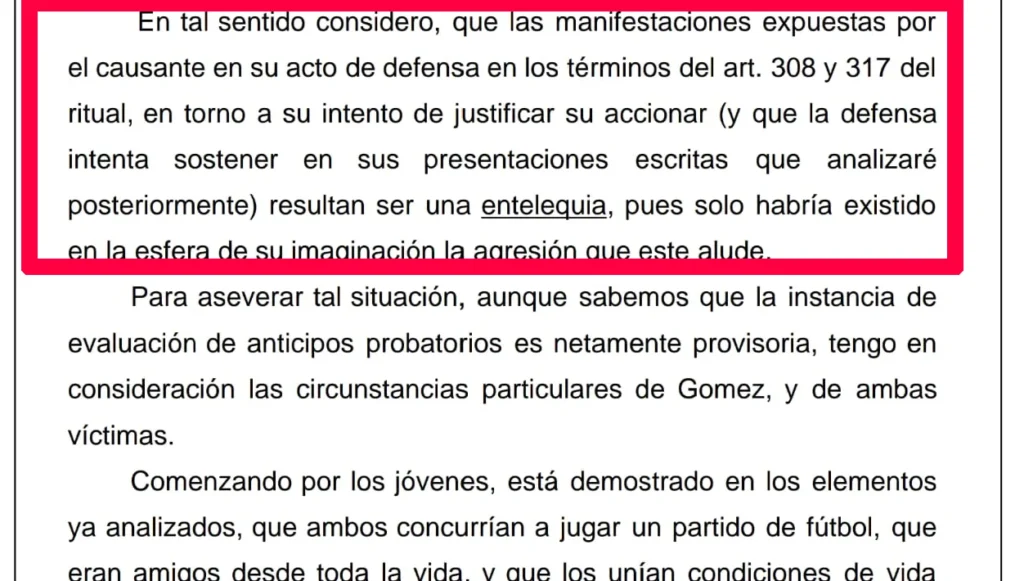 “Considero que las manifestaciones expuestas por el causante (el policía Lucas Adrián Gómez) en su acto de defensa en torno a su intento de justificar su accionar (y que la defensa intenta sostener en sus presentaciones escritas que analizaré posteriormente) resultan ser una entelequia, pues solo habría existido en la esfera de su imaginación la agresión que alude”.