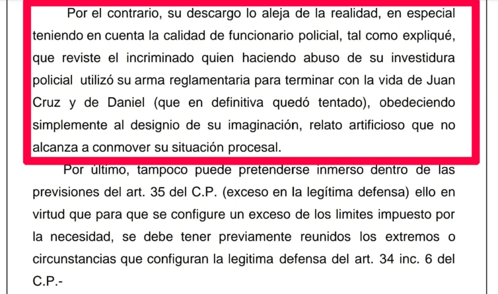 Su descargo lo aleja de la realidad, en especial teniendo en cuenta la calidad de funcionario policial que reviste quien haciendo abuso de su investidura utilizó su arma reglamentaria para terminar con la vida de Juan Cruz y de Daniel (que en definitiva quedó tentado), obedeciendo simplemente al designio de su imaginación y relato artificioso”, agregó el magistrado, que trabajó el fallo con su secretario Diego Prieto.