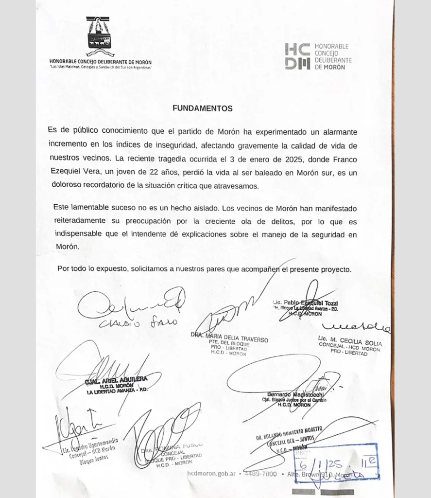 Con la firma de las y los concejales María Delia Traverso, Cecilia Solía y Romina Fusco (bloque Pro Libertad); Leandro Ugartemendia, Bernardo Magistocchi y Claudio Faro (Juntos); Ariel Aguilera y Pablo Tozzi (La Libertad Avanza); y Rolando Moretto (UCR), la nota presentada ayer reclama la presencia del jefe comunal o del funcionario que designe en el Concejo Deliberante.