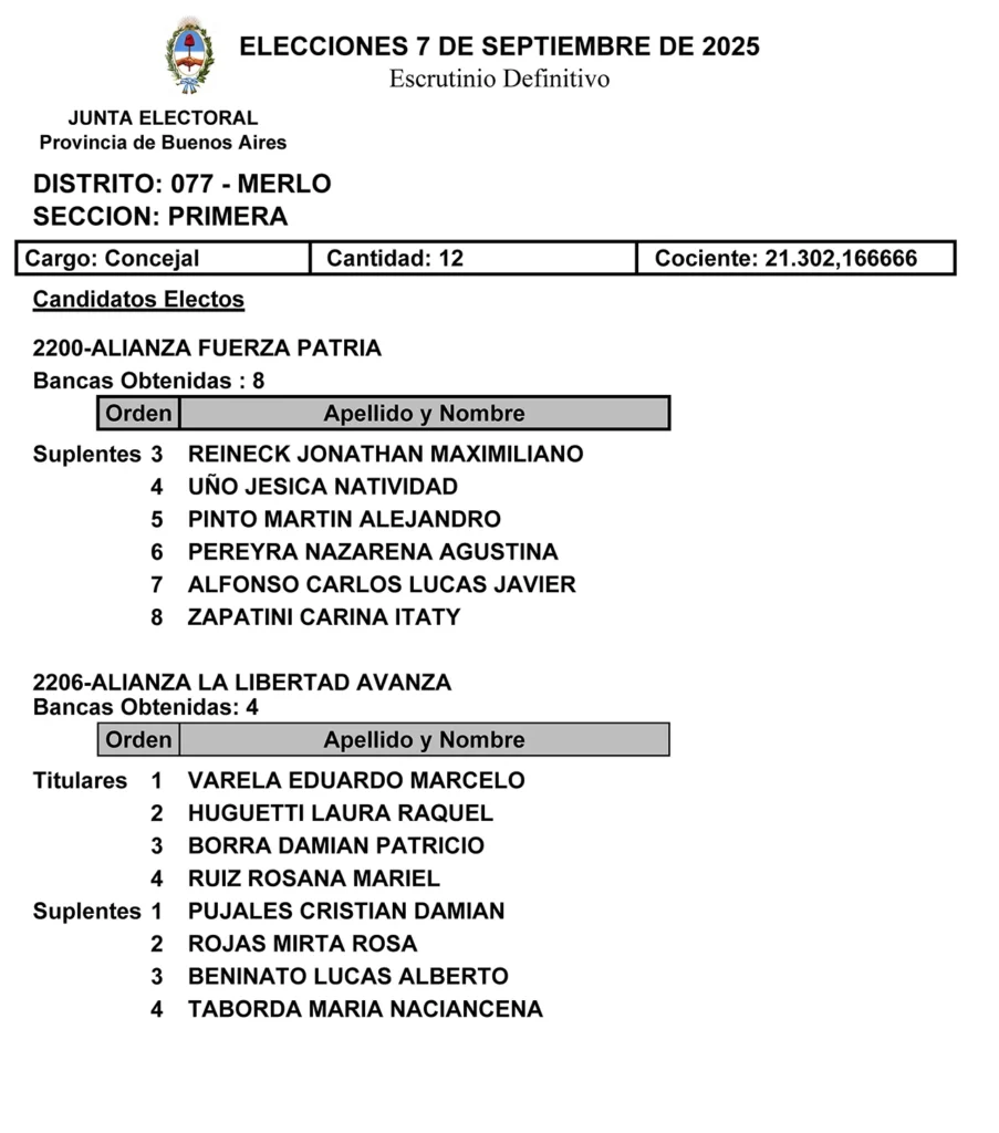 Como se recordará, en el mencionado comicio de medio término Fuerza Patria se impuso con el 44,21% de los votos contra 29,24% de La Libertad Avanza. 8 concejales se llevó la boleta ganadora y las 4 bancas restantes fueron para los libertarios, ya que ninguna de las otras fuerzas llegó al piso para acceder al deliberativo.