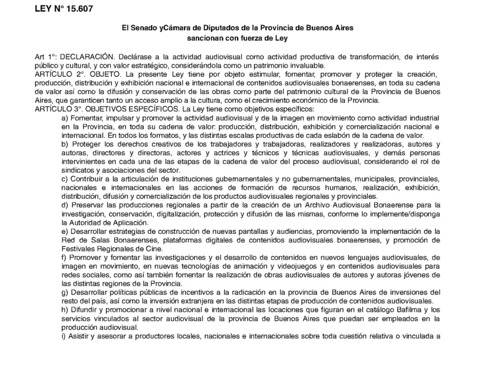 La Ley de Promoción y Desarrollo de la Industria Audiovisual de la Provincia de Buenos Aires busca estimular, fomentar y promover la creación, producción y exhibición de contenidos audiovisuales bonaerenses. Además, crea un fondo de fomento, un consejo de la producción audiovisual y un registro único.