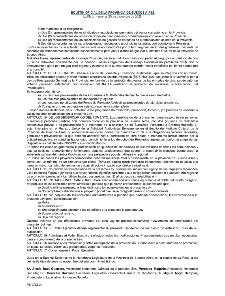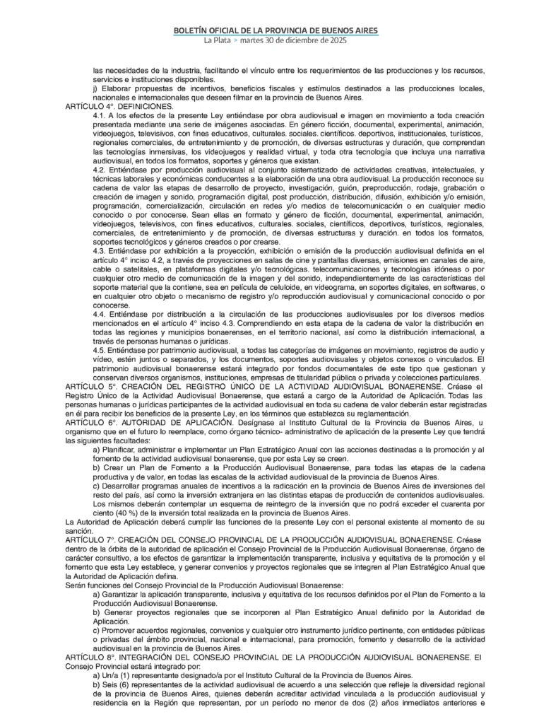 Por otra parte, se constituirá el Consejo Provincial de la Producción Audiovisual Bonaerense, para una implementación transparente, inclusiva y equitativa. También con el objeto de generar convenios y proyectos regionales. Estará compuesto por representantes del Instituto Cultural, de la actividad audiovisual, sindicatos y asociaciones gremiales, asociaciones de directores y productores, asociación de gestión de derechos de autor y universidades estatales.