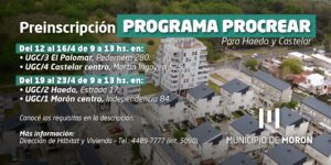 Del 12 al 23 de abril estará abierta la preinscripción al programa Procrear para la asignación de 24 viviendas nuevas en los Desarrollos Urbanísticos de Castelar Sur (UGC 14) y Haedo (UGC 2).