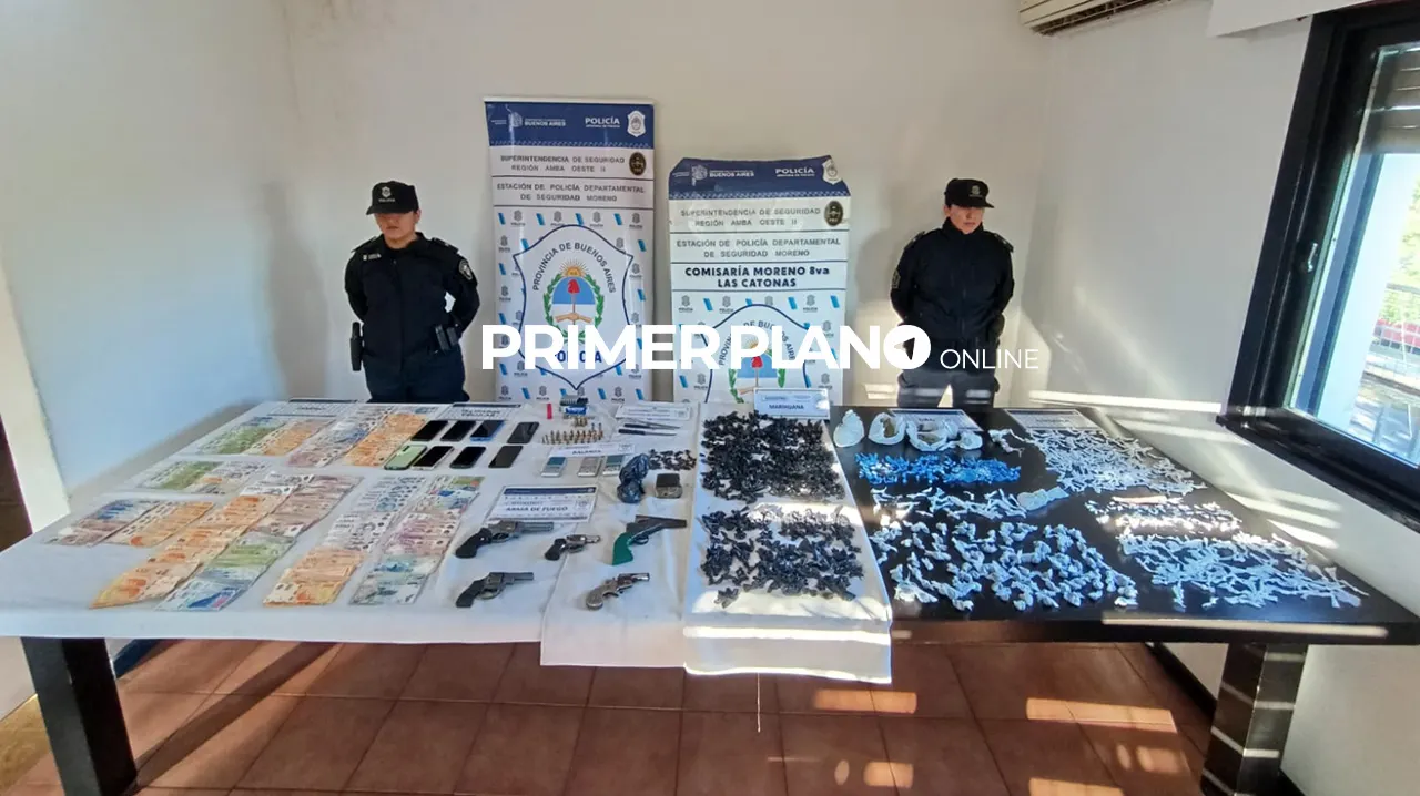 De los 12 procedimientos realizados, 10 domicilios corresponden a Moreno y 2 a General Rodríguez. En total secuestraron 760 envoltorios, más medio kilo de cocaína y 400 envoltorios de marihuana, con elementos compactos de cerca de 300 gramos. Además, incautaron balanzas de precisión, dinero en efectivo (alrededor de $250.000), celulares y 5 armas de fuego.