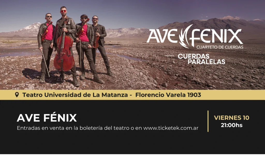 El Teatro Universidad de La Matanza presenta en su sala al cuarteto de cuerdas Ave Fenix, que brindara su espectáculo a las 21hs. Este conjunto dirigido por Manuel Wirtz se aventura a interpretar diferentes géneros musicales, tanto pop como rock, clásicos, electrónica y música de cine con sus clásicos instrumentos de cuerdas.