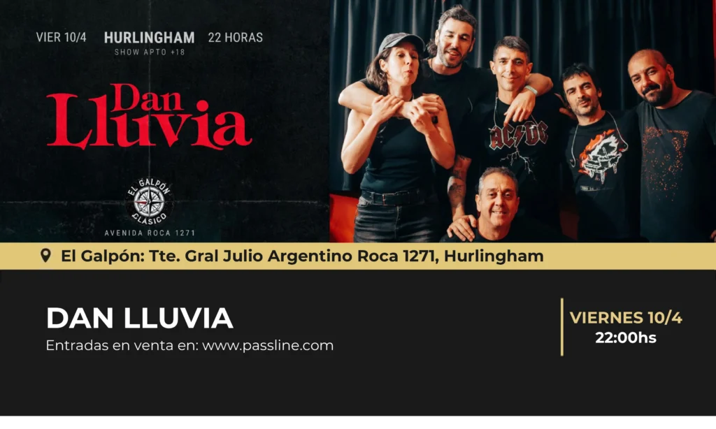 Dan Lluvia, La banda del Panter Giuliano vuelve a El Galpón de Hurlingham, en un show apto para mayores de 18 años. Sus melodías y letras nos pintan un paisaje con una atmósfera de arrabal, mezcla de Rock y de Tango, acompañadas por una música contundente, sinergia entre potencia y sutilezas.