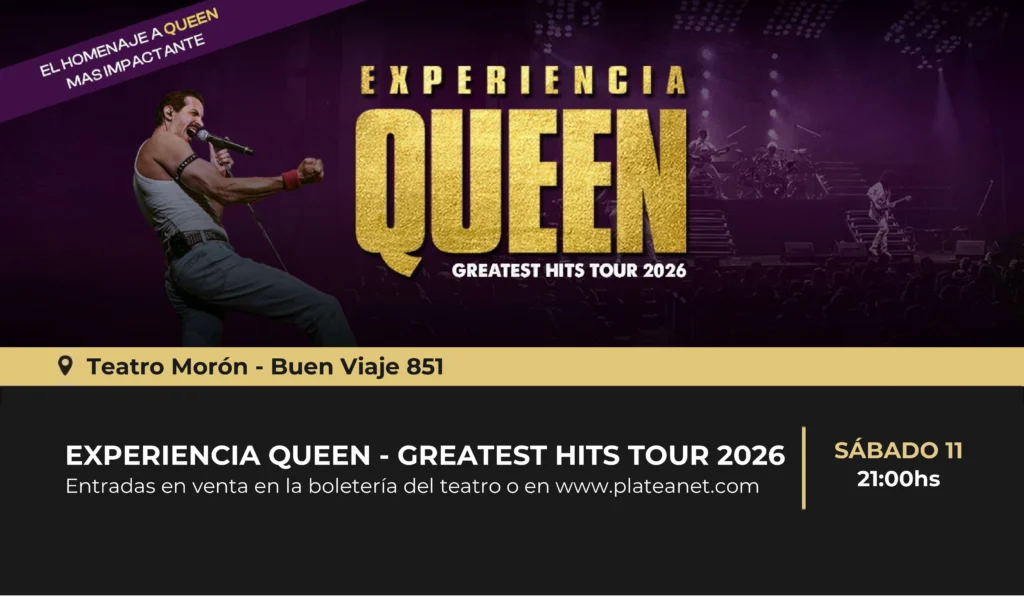 Experiencia Queen llega con su espectacular Greatest Hits Tour 2026 a las 21hs en el teatro Morón. El show promete llevar al público a revivir los grandes éxitos de Queen en una única noche, transportándolos a los icónicos conciertos de la banda de manera fiel y deslumbrante.