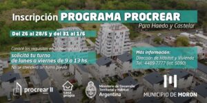 Reabre la preinscripción a los complejos urbanísticos del programa Procrear, ubicados en Castelar sur y Haedo. En esta oportunidad, sólo se realizará con turnos previos desde el 26 de mayo hasta el 28 de este mes. Mientras que el segundo turno será desde el 31 de mayo hasta el 1 de junio. En ambos casos el horario será de 9 a 13.