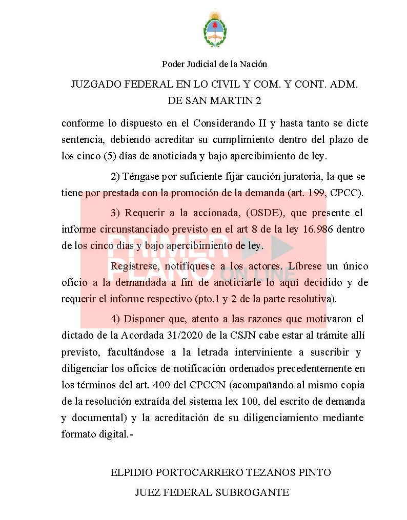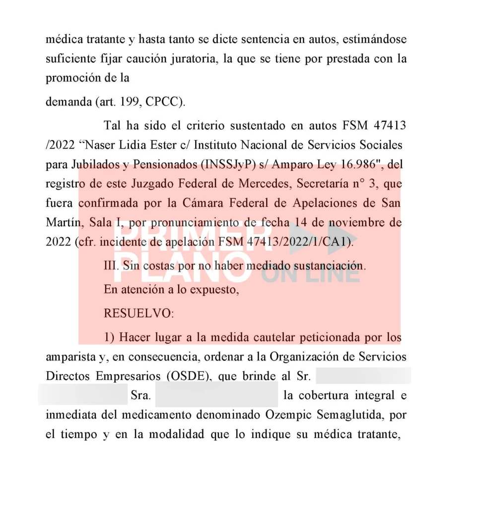 Lo hizo bajo apercibimiento de ley, con multas por día de incumplimiento luego del plazo de 5 días de notificada la empresa. Según pudo confirmar Primer Plano Online OSDE recurrió el fallo y el juzgado le concedió la apelación, aunque con efecto devolutivo. Eso significa que, mientras tanto resuelve la Cámara de Apelaciones, la sentencia está vigente y debe entregar la medicación.