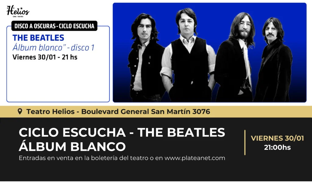 Para cerrar el mes de enero, el Teatro Helios presenta su Ciclo Escucha, a las 21hs. En esta oportunidad, se podrá disfrutar del Álbum Blanco de The Beatles en versiones remasterizadas y con sonido envolvente 7.1, en una sala acustizada para la ocasión y en plena oscuridad. Con una lista de 17 temas en total (45 minutos aprox.), en esta primera fecha se reproducirá el Disco 1.
