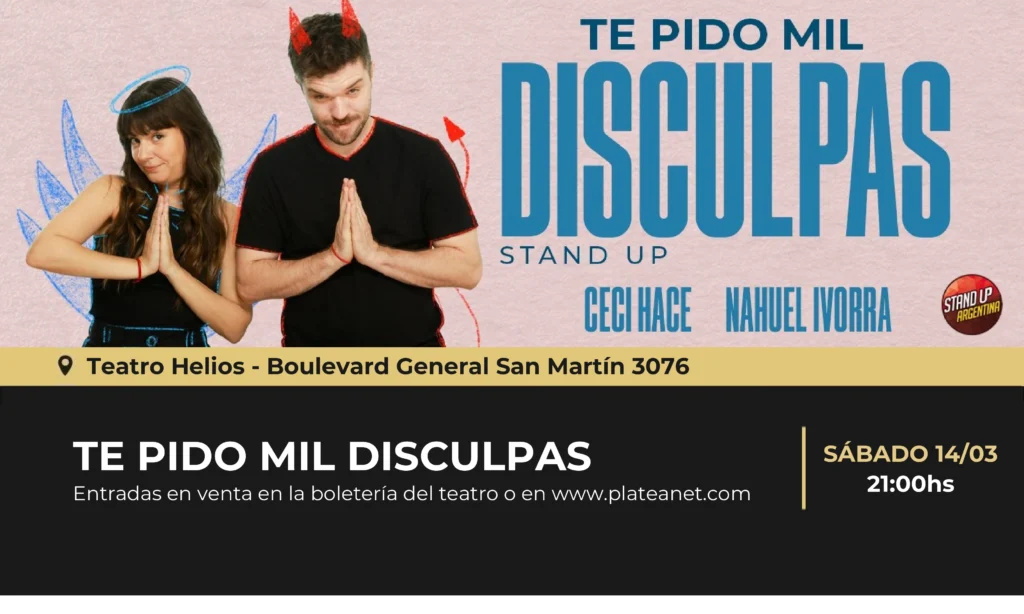Te pido mil disculpas, el espectáculo protagonizado por Ceci Hace y Nahuel Ivorra, se presenta a las 21hs en el Helios. Dos comediantes que lo único que quieren es hacer reír a la gente… aunque a veces puedan pasarse de la raya.