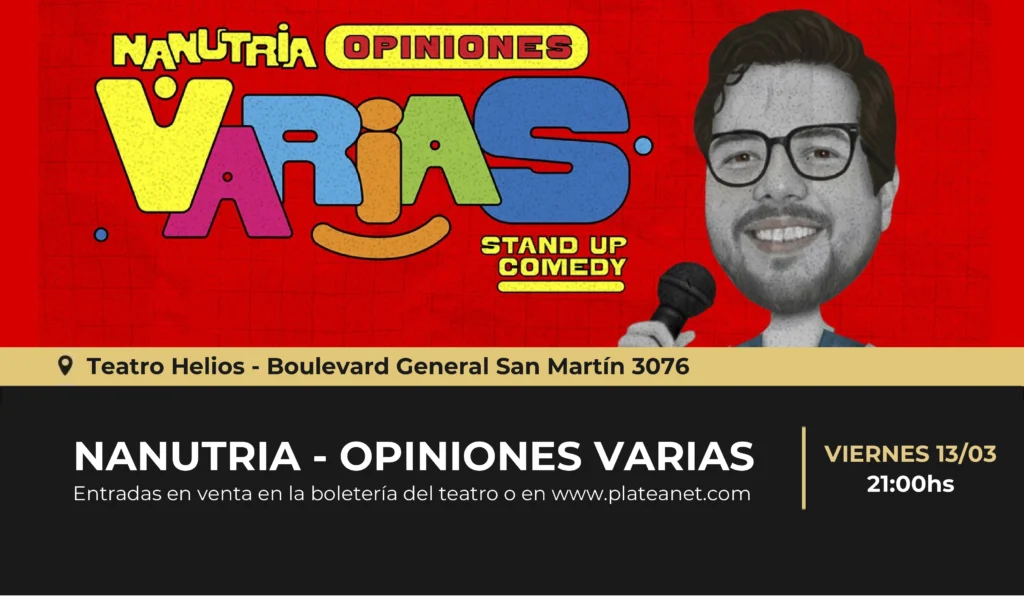El Teatro Helios presenta, a las 21 hs, Opiniones Varias, el show de stand up de Nanutria. Durante más de una hora, el público se embarcará en una montaña rusa de reflexiones graciosas e inusuales sobre una infinidad de temas. A esto se suman improvisaciones ingeniosas y dinámicas charlas con el público, garantizando un espacio donde la distracción y las carcajadas sin prejuicios son protagonistas.